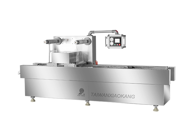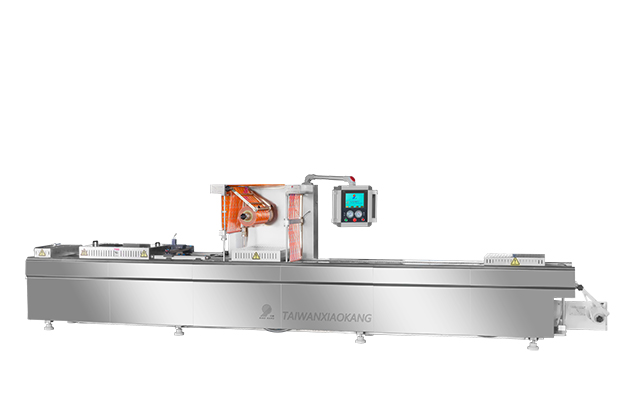 氣調(diào)盒式真空包裝機(jī)工作原理: 先將產(chǎn)品放在托盤里,再將托盤放入設(shè)備的放料區(qū),托盤隨著鏈條的向前運(yùn)行進(jìn)入到封口模具里 ,模具上升,在封口模具里將上膜附在托盤上,先抽真空(可根據(jù)用戶產(chǎn)品包裝要求,在抽象真空 的基礎(chǔ)上,充氮氣或混合氣體進(jìn)行包裝)封口、(上膜和托盤封在一起)沖切,最后排氣,降膜, 包裝好的產(chǎn)品隨著鏈條繼續(xù)向前運(yùn)行,從出料口出料。設(shè)備還附加了光電跟蹤對齊彩膜系統(tǒng),為用 ...